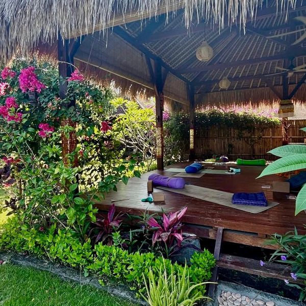Curtained by flowering bougainvillea and fragrant frangipani, the shala overlooks our lush green lawn and tropical gardens, creating a serene backdrop for yoga, meditation, and mindful movement. Crafted with beautifully structured high Balinese ceiling, an alang alang thatched roof, and a polished timber floor, the space feels earthy, grounded, and deeply connected to its surroundings.